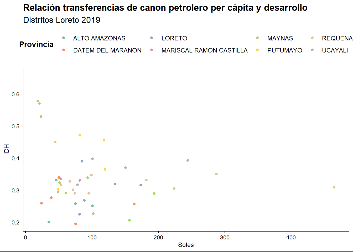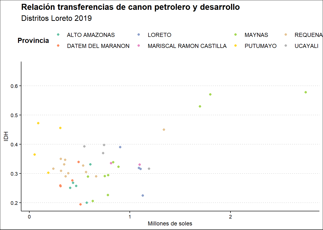 El presente análisis busca explorar el comportamiento de la relación entre las transferencias de canon petrolero al departamento de Loreto y el nivel de desarrollo humano para el año 2019.